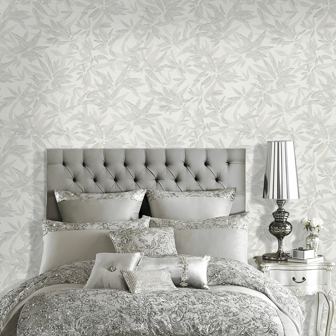 Стильные обои в флористическом стиле с мотивом листьев Eclectic придают интерьеру особую изысканность и уют. Серебряный цвет добавляет помещению элегантности и шарма, делая его более привлекательным и стильным.